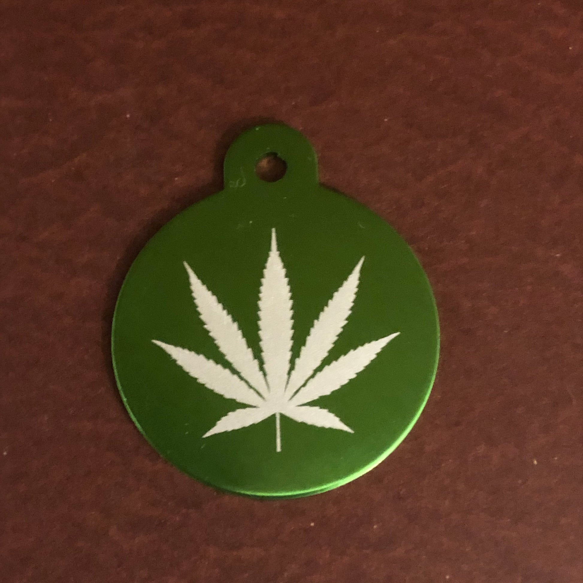 These Large Green Marijuana Leaf Circle Aluminum Tags measure approximately 1 1/4"W x 1 1/2"H
