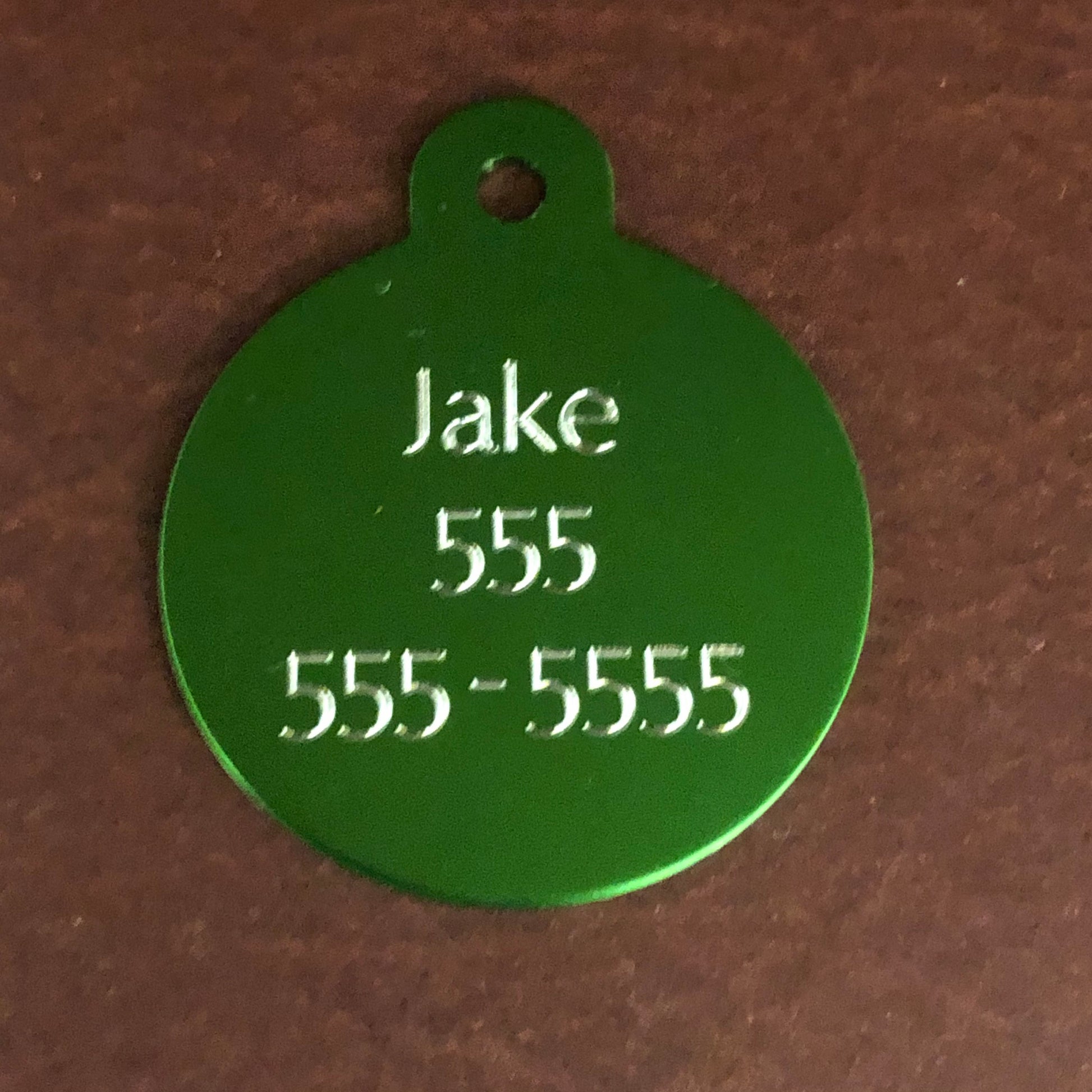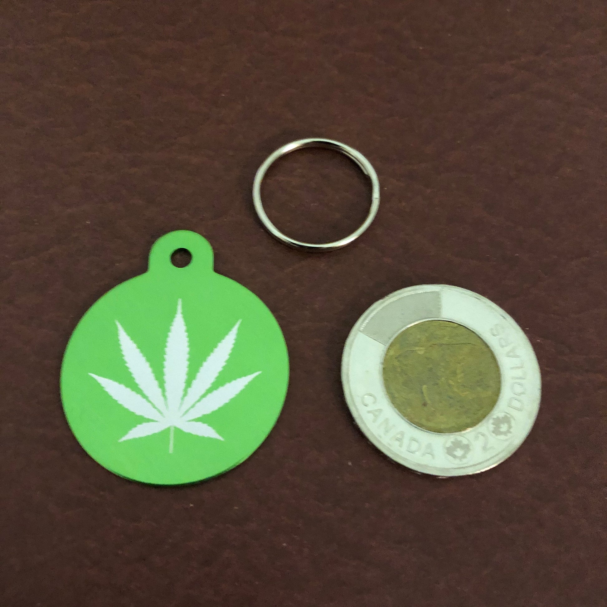 The tag will have the marijuana leaf design on the front and will be engraved on the back in Optima font.