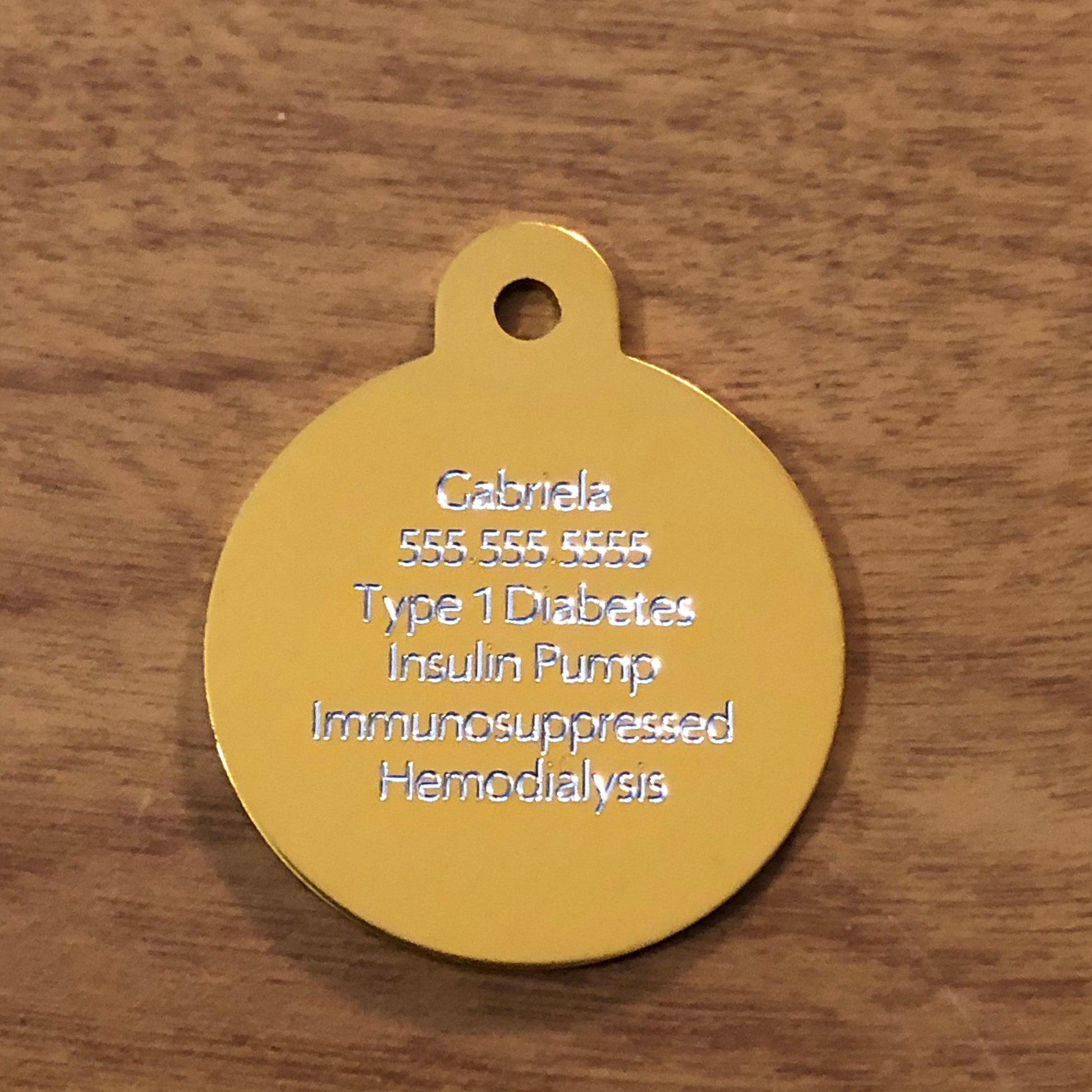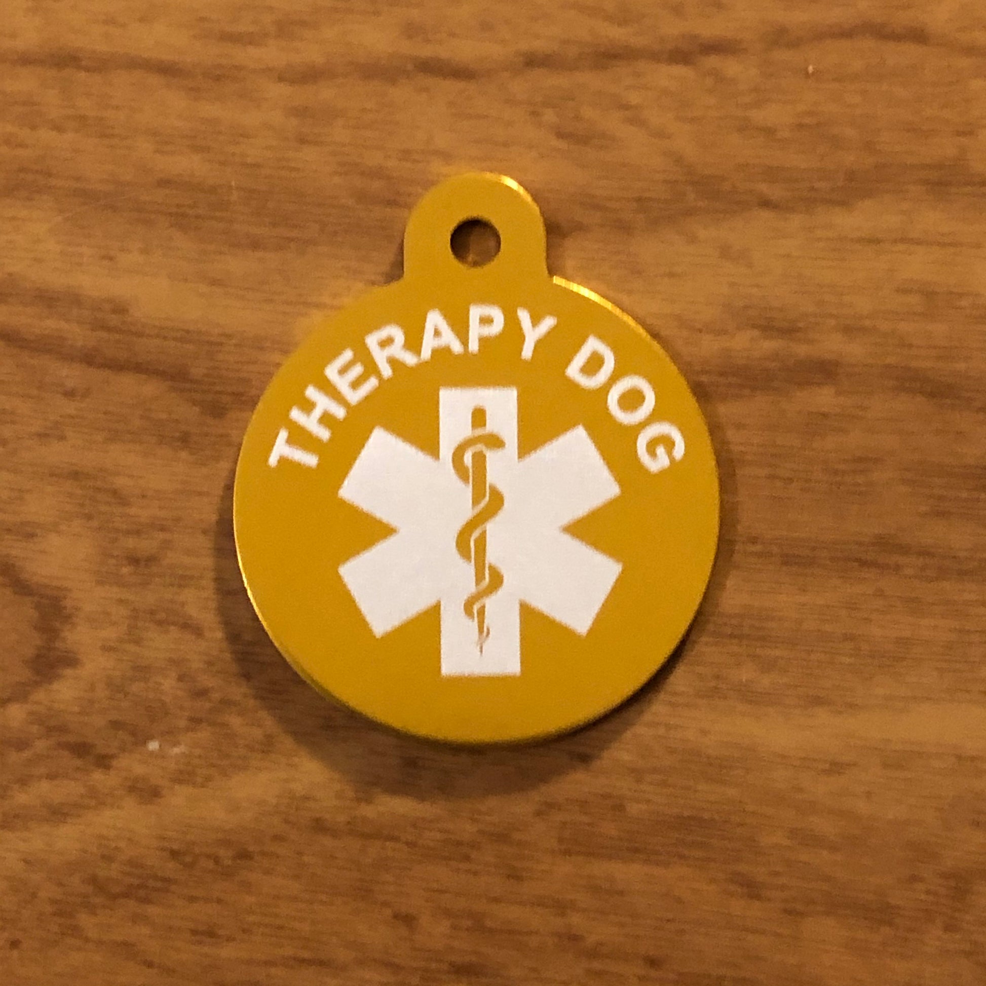 The tag will have the Medical Alert Therapy Dog Alert on the front and will be engraved on the back in Optima font.